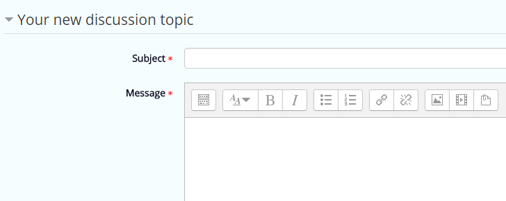 Add a forum topic Before you begin Make sure you are logged in as Student. Procedure In the Navigation block on the right, click on Courses. Click on the name of the course in which you want to add a forum topic. On the course page, click on the forum icon or on the name of the forum in the section in which you want to use the forum. Figure: Forum on course page The teacher may provide options to use a forum for different topics in addition to the default forum announcements. You will see the forum page with forum entries. You now have the option to start a new discussion or reply to pre-existing entries. In order to start a new topic, click on Add a new discussion topic. Figure: Add forum topic You will see the Your new discussion topic page.Figure: Your new discussion topic page In the form, fill in the required text boxes next to Subject and Message which are marked with an asterisk. You can adjust further settings or add files to your post Click on the button Post to forum on the bottom of the page to confirm your entry. Figure: Post new discussion topic ResultsYou have created a new discussion topic in the forum, which will appear in the list of forum entries.