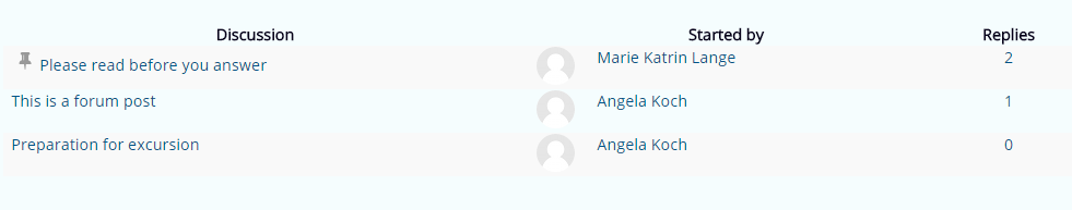 The teacher may provide options to use a forum for different topics in addition to the default forum announcements.You will see the forum page with forum entries. You now have the option to start a new discussion or reply to pre-existing entries. -