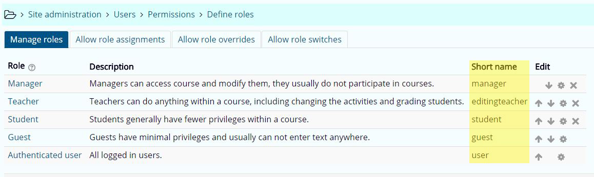 Figure: The short names of the roles highlighted in yellow