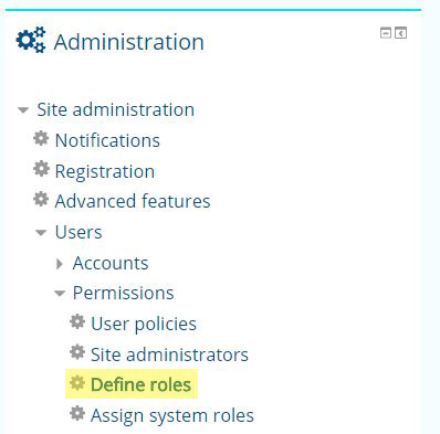 In the Administration block, click on: Site administration > Users > Permissions > Define
